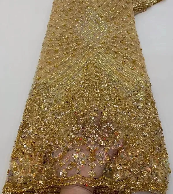5 Yards African Gold Lace Tulle Fabric Sequins Embroidery Nigerian Handmade Luxury Beaded Lace for Party