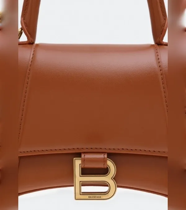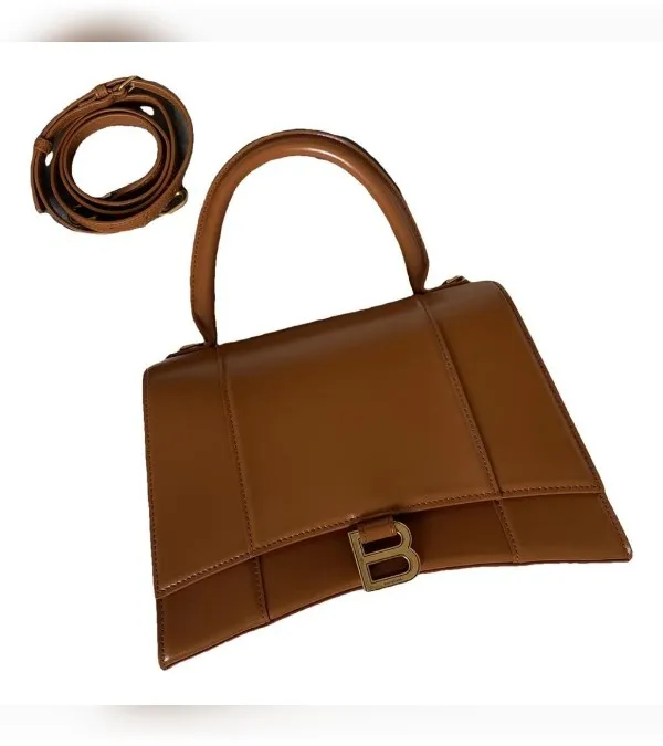 This stylish and structured handbag is crafted of brown calfskin leather. The bag features a sturdy leather top handle with ruthenium links and a prominent B logo on the front flap, and an optional, adjustable shoulder strap. The front flap opens with a magnetic snap closure to a smooth black leather compact interior. Exterior Material: Black smooth calfskin leather exterior with a top handle and a removable shoulder strap.
