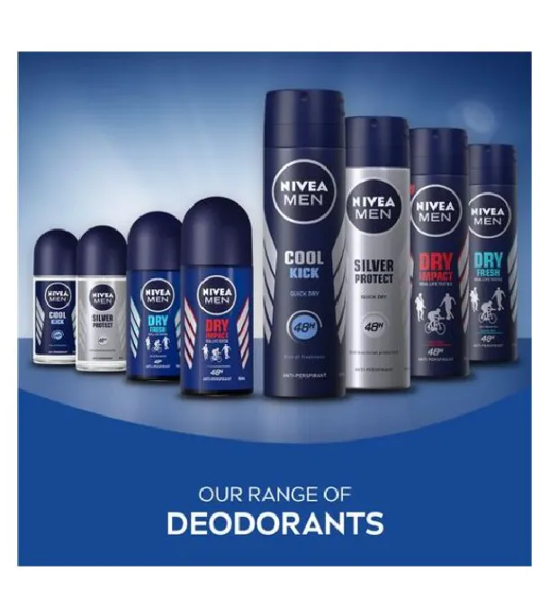 NIVEA MEN Dry Impact anti-perspirant deodorant offers you powerful protection tested in real life situations. NIVEA MEN Dry Impact combines 48 hours reliable protection against sweat and body odour with care for your underarm skin. Clean and inviting, an aromatic fresh blend of tangy citrus and herbal notes, Dry Impact fragrance is designed for men who want maximum protection. It gives you extra anti-perspirant performance for a dry feeling and caring 48h protection against sweat and body odour. For the first time NIVEA MEN research developed a formula containing a second, additional anti-perspirant agent. This unique “DryPlus system” gives you reliable, 48h protection against sweat and body odour. Effective regulation of perspiration with DryPlus System.