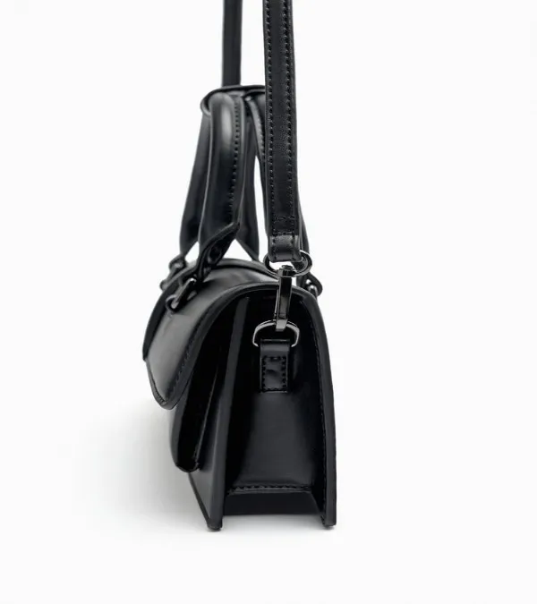 Long-shaped city bag. Front pocket. Handles and crossbody shoulder strap. Lined interior. Magnetic clasp closure on the flap.
